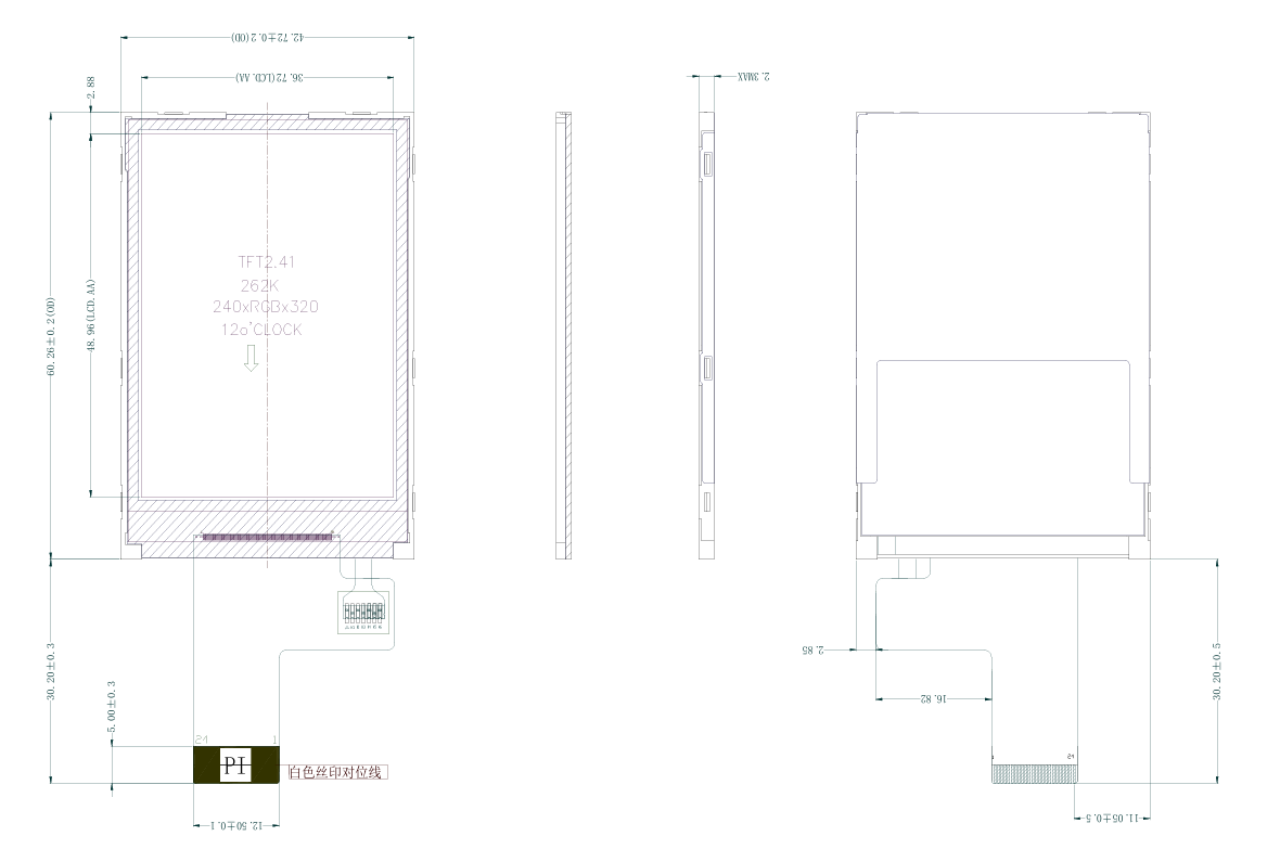 2,4-дюймовий зазвичай білий невеликий TFT РК-дисплейний модуль TF використовує режим відображення «білий режим», забезпечуючи високу роздільну здатність 240 × RGB × 320 пікселів і підтримує 8/16-бітний паралельний інтерфейс (синхронізація 8080) MCU, сумісний з різними мікроконтролерами.